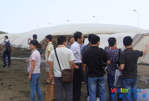 考察人員對于膜覆蓋高溫好氧發(fā)酵工藝技術(shù)十分感興趣,爭相提問希望了解更多這項工藝技術(shù)的詳細信息。講解人員與考察員現(xiàn)場交流,并耐心介紹稱,該工藝技術(shù)的核心是一種具有特征微孔的功能膜,其半滲透功能能夠?qū)崿F(xiàn)一個較恒定的氣候環(huán)境,在鼓風的作用下,在發(fā)酵體內(nèi)能夠形成一個微高壓內(nèi)腔,使堆體供氧均勻充分,溫度分布均勻,為好氧發(fā)酵構(gòu)建成一個適宜的小環(huán)境。同時,水蒸氣和二氧化碳能夠借助功能膜的微孔結(jié)構(gòu)擴散出去,維持了發(fā)酵堆體膜內(nèi)外的氣流平衡,保證好氧發(fā)酵進行得更加充分徹底。