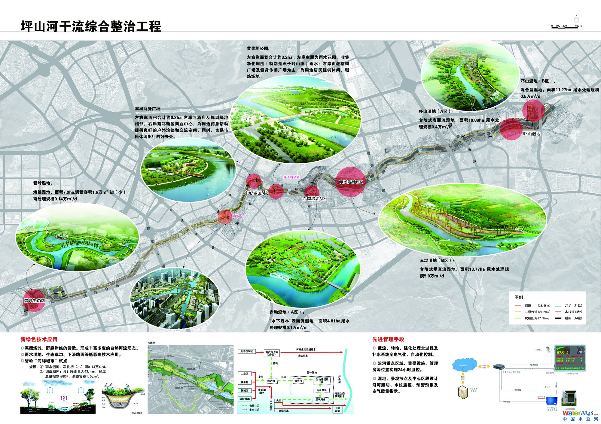 坪山河干流水質(zhì)提升工程主要包括對(duì)河道及周邊的現(xiàn)狀調(diào)查研究與評(píng)估,對(duì)已有工程設(shè)計(jì)的優(yōu)化和完善,水質(zhì)達(dá)標(biāo)提升,老河道綜合整治,與干流關(guān)聯(lián)的市政配套、截污系統(tǒng)的完善,防洪攔截、水資源利用與調(diào)配,初雨與雨洪截流、調(diào)蓄、處置,污水深度處理及回用工程,完善生態(tài)濕地系統(tǒng)、完善河岸綠道系統(tǒng)等。