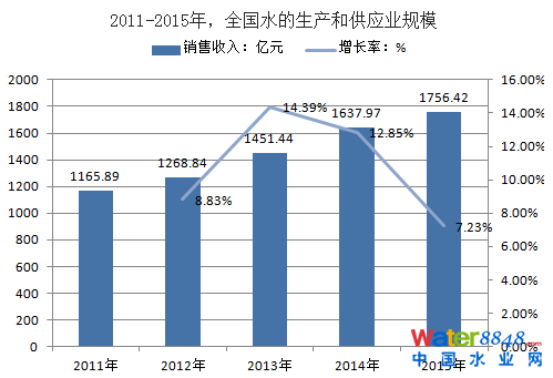 2015年,我國水務行業(yè)規(guī)模以上企業(yè)資產(chǎn)總額達9807.78億元;水的生產(chǎn)和供應業(yè)企業(yè)銷售收入1756.42億元,同比增長了7.23%,自來水的生產(chǎn)和供應行業(yè)共計實現(xiàn)銷售收入為1323.39億元,同比增長8.26%。