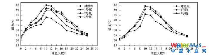 溫度與堆體中微生物的代謝活動(dòng)密不可分,可間接地表現(xiàn)微生物對有機(jī)質(zhì)的利用程度,亦從一定意義上可表征堆肥效應(yīng)是否達(dá)到無害化,因此本實(shí)驗(yàn)對兩個(gè)堆肥周期堆體溫度的變化進(jìn)行了分析,如圖 1所示.