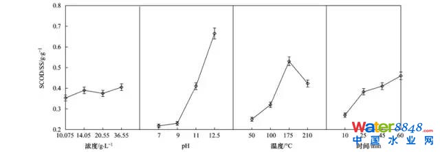 為了驗(yàn)證正交試驗(yàn)得出的單位污泥SCOD隨溫度和pH的變化趨勢,進(jìn)行如下驗(yàn)證試驗(yàn):采用8 mol ˙L-1 NaOH分別將污泥pH調(diào)節(jié)為6.9±0.1、 9.0±0.1、 10±0.1、 11.5±0.1、 12.5±0.1,并穩(wěn)定5 min. 再將上述5種不同pH值污泥分別置于20、 100、 175及210℃處理60 min,冷卻后進(jìn)行相關(guān)分析,各做3組平行試驗(yàn). 1.3 分析方法