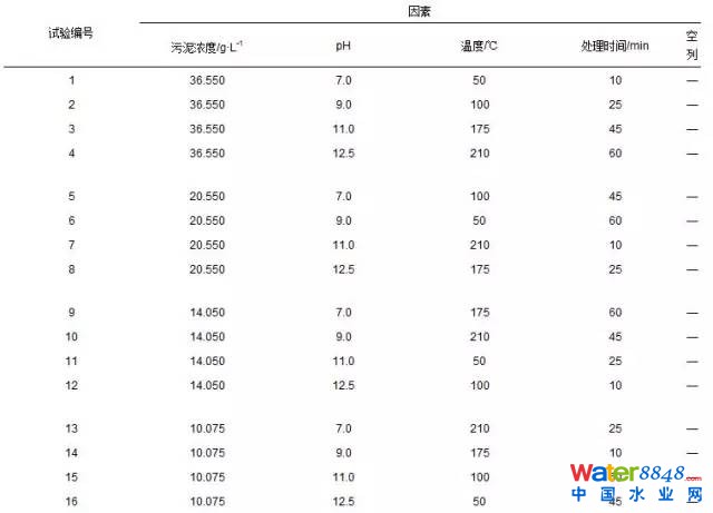 然而,目前污泥熱堿處理的研究大多僅限于各單因素(如溫度、 pH值等)和雙因素(如溫度-pH、 溫度-時(shí)間、 pH-時(shí)間等),缺乏多種因素的綜合影響研究. 為了考察熱堿處理過程中各因素同時(shí)作用對(duì)污泥特性的綜合影響,本研究采用正交試驗(yàn)同時(shí)考察不同污泥濃度、 pH、 溫度和處理時(shí)間的組合條件對(duì)污泥特性的影響,并找出熱堿處理的最優(yōu)組合條件.