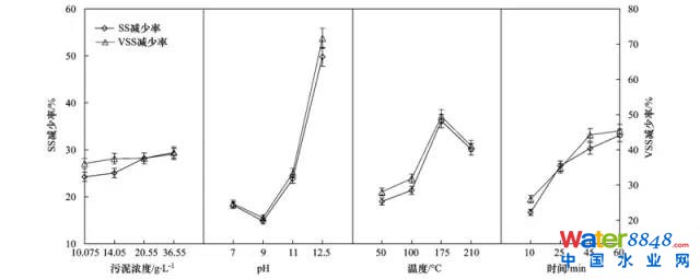 根據(jù)表 2中的試驗(yàn)結(jié)果,可以得到污泥SS、 VSS減少率隨4個(gè)因素的變化(圖 3). 從圖 3中可知,SS、 VSS減少率隨處理時(shí)間延長和污泥濃度升高而升高,但隨污泥濃度的增加幅度小,這一變化規(guī)律與文獻(xiàn)一致. 此外,SS、 VSS減少率隨溫度的升高呈先升高后降低的趨勢,此趨勢與文獻(xiàn)一致. 但是,SS、 VSS減少率卻隨pH的升高呈先降低后升高的趨勢. 圖 3表明,在本試驗(yàn)條件下,4個(gè)因素對(duì)熱堿處理降低SS、 VSS的最佳組合條件為:污泥濃度36.55 g ˙L-1、 pH 12.5、 溫度175℃和處理時(shí)間60 min. 對(duì)比單位污泥SCOD和污泥濃度(SS和VSS)的變化(表 2、 圖 1和圖 3)可知,4個(gè)因素對(duì)3個(gè)參數(shù)的影響相似,這主要是由于污泥SCOD的釋放來源于污泥絮體和微生物細(xì)胞的破裂、 融胞所釋放的有機(jī)物,有機(jī)物釋放會(huì)使一部分不溶性物質(zhì)轉(zhuǎn)化為溶解性物質(zhì),從而降低污泥濃度.
