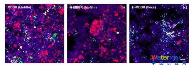 Anammox菌用紫紅色標(biāo)記;AOB菌則用白色標(biāo)記;NOB菌為綠色標(biāo)記;DAPI染色液為藍(lán)色(右下角的刻度是20um)