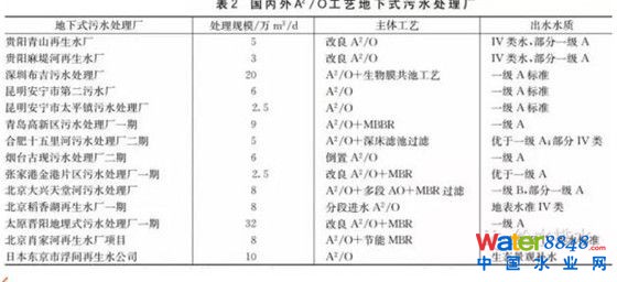 AAO工藝及其改良工藝,如Anoxic-AAO工藝、分段進(jìn)水AAO工藝、多級(jí)A/O工藝等,具有脫氮除磷效率高、有效抑制絲狀菌膨脹、運(yùn)行費(fèi)用低等優(yōu)勢(shì)。為獲得更高、更穩(wěn)定的出水水質(zhì),在設(shè)計(jì)地下式污水處理廠時(shí),常把AAO工藝與其他工藝設(shè)備組合使用,例如MBR、MBBR、深床濾池、纖維轉(zhuǎn)盤(pán)濾池等。目前,我國(guó)采用AAO工藝的地下式污水處理廠如表2所示。
