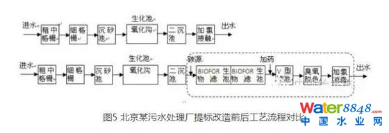 該廠規(guī)模為2萬m3/d,原工藝:氧化溝,出水標(biāo)準(zhǔn)一級A。改造工藝:氧化溝+兩級生物濾池+V型濾池+臭氧脫色,出水標(biāo)準(zhǔn)為北京市《城鎮(zhèn)污水處理廠水污染物排放標(biāo)準(zhǔn)》(DB11/890-2012)B標(biāo)準(zhǔn)。改造前后工藝流程詳見圖5。