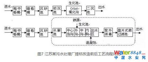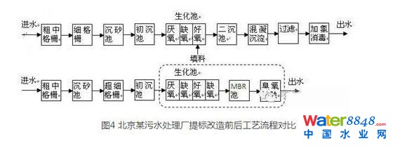 該污水廠處理規(guī)模為15萬m3/d,原工藝:Orbal氧化溝,出水標(biāo)準(zhǔn)一級B。改造工藝:BNR+MBR,出水標(biāo)準(zhǔn)一級A。提標(biāo)改造前后工藝流程詳見圖7。