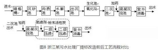 該污水處理廠處理規(guī)模為15萬m3/d,原工藝:A2/O改良氧化溝+混凝沉淀,出水標(biāo)準(zhǔn)一級B。改造工藝:A2/O改良氧化溝+混凝沉淀+活性炭二級吸附、壓濾,出水標(biāo)準(zhǔn)一級A。提標(biāo)改造前后工藝流程詳見圖8。