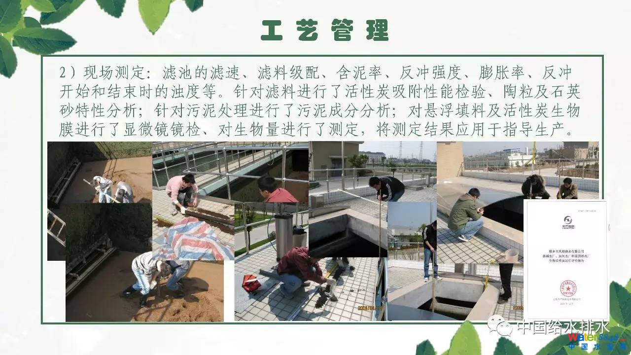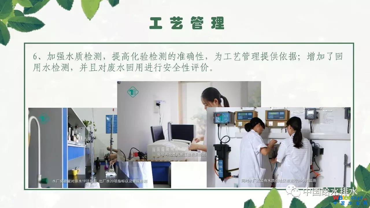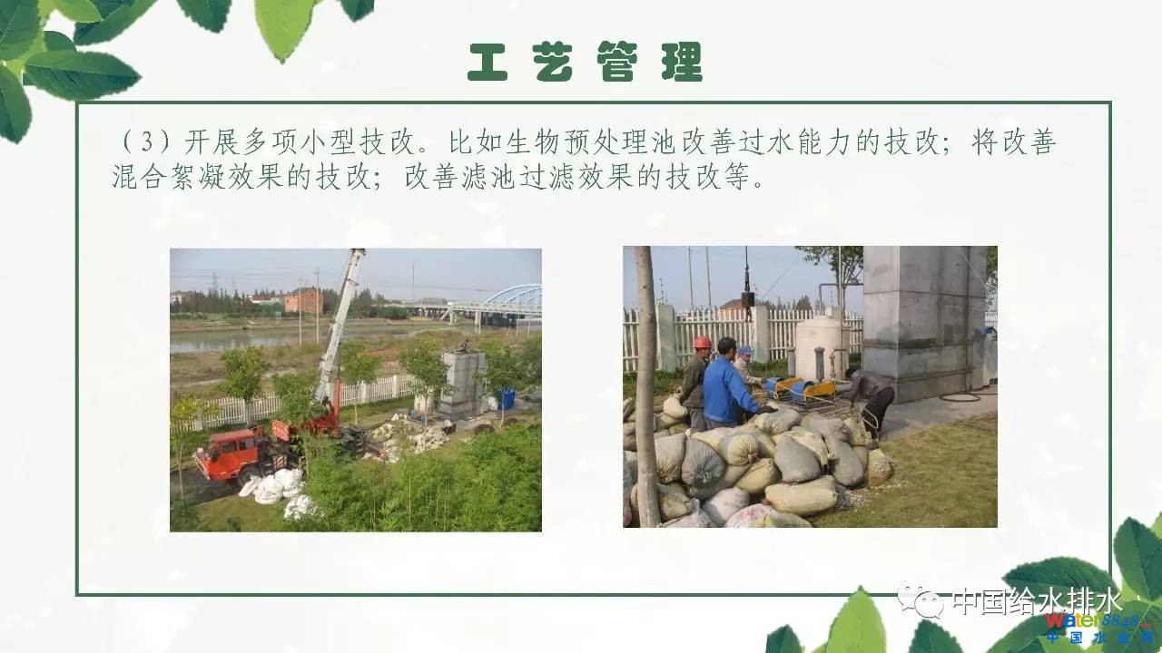 運(yùn)河水廠就地取用河網(wǎng)水源(京杭運(yùn)河),從對源水的監(jiān)測情況來看,有機(jī)污染比較嚴(yán)重,屬于微污染水源,原水水質(zhì)多項(xiàng)指標(biāo)不符合《地表水環(huán)境質(zhì)量標(biāo)準(zhǔn)》(GB3838-2002)的相關(guān)要求,總體水質(zhì)以IV~V為主。凈水工藝采用生物預(yù)處理+強(qiáng)化常規(guī)處理+臭氧活性炭深度處理工藝。報(bào)告詳細(xì)介紹了運(yùn)河水廠在工藝管理方面的一些措施,例如不斷完善工藝管理手冊,工藝管理手冊內(nèi)容涵蓋水廠概況、工藝管理、檢測方法、工藝原理、工藝調(diào)整、水質(zhì)標(biāo)準(zhǔn)及規(guī)范等七個方面;選擇適合的藥劑品種開展小試;工藝設(shè)施按要求巡查及維護(hù);工藝參數(shù)的技術(shù)測定與分析評估,掌握各單體生產(chǎn)運(yùn)行的實(shí)際情況,通過測定數(shù)據(jù)分析運(yùn)行狀況是否合理;優(yōu)化內(nèi)控標(biāo)準(zhǔn),嚴(yán)格控制水質(zhì),制定有針對性的各工藝單元內(nèi)控標(biāo)準(zhǔn)等。