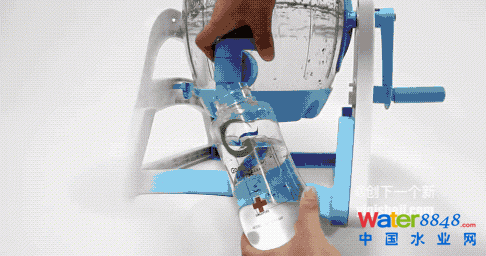 為了更方便的使用凝固劑來凈化水,他們還設(shè)計(jì)了一個(gè)大的凈水罐,它的中間有濾網(wǎng),臟東西與凝固劑的混合物都可被它吸入,你只要轉(zhuǎn)動(dòng)搖把就好。