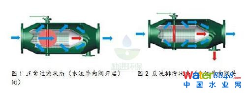 當(dāng)過濾器工作時(shí)(如圖1所示),水流導(dǎo)向閥處于開啟狀態(tài),水流由入口口進(jìn)入過濾器,經(jīng)過漶網(wǎng)過濾后流入出ロ。本機(jī)采用壓差控制、定位控制自自動(dòng)清洗濾網(wǎng)。當(dāng)過濾器進(jìn)出口差壓達(dá)設(shè)定值或定時(shí)器達(dá)到預(yù)置時(shí)間時(shí),電動(dòng)控制箱發(fā)出信號(hào),排污閥打開,水流導(dǎo)向閥處于開啟狀態(tài)(如圖2所示)),水流沖洗粘在濾網(wǎng)內(nèi)壁上的雜質(zhì)被進(jìn)一步?jīng)_洗排出,當(dāng)水流導(dǎo)向閥處于全關(guān)狀態(tài)下,水流被迫從過濾器進(jìn)口段網(wǎng)孔進(jìn)入濾網(wǎng)外側(cè),大部分凈液從出口流出,部分凈液又從濾網(wǎng)外側(cè)進(jìn)入漶網(wǎng)內(nèi)部(因?yàn)橄到y(tǒng)會(huì)處于泄壓狀態(tài),濾網(wǎng)內(nèi)部壓力小于外側(cè)壓力),從而對(duì)濾網(wǎng)進(jìn)行反沖洗,特殊結(jié)構(gòu)的不銹鋼契形濾網(wǎng)使得在漶網(wǎng)內(nèi)部產(chǎn)生了噴射效果,任何雜志都被從光滑的內(nèi)壁上沖走。當(dāng)過濾器進(jìn)出口壓差恢復(fù)正;蚨〞r(shí)器設(shè)定時(shí)間結(jié)束后,電動(dòng)排污閥關(guān)閉,水流導(dǎo)向閥開啟。整個(gè)沖洗過程系統(tǒng)可正常工作,無需停機(jī)。