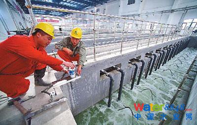 中鐵上海工程局安裝人員在福州洋里污水廠二期MBR池調(diào)試液位計(jì)。新華社發(fā)