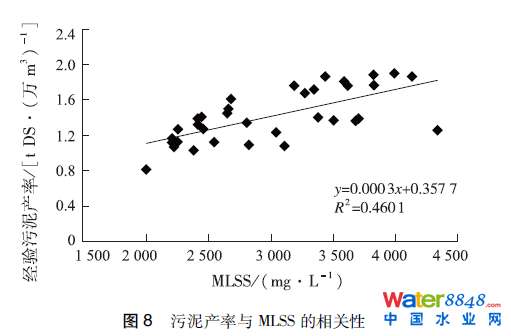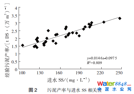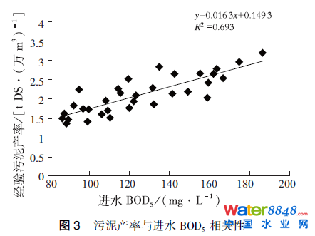 (2)經(jīng)驗(yàn)污泥產(chǎn)率與進(jìn)水有機(jī)物含量和懸浮固體濃度呈顯著正相關(guān)性,冬春季進(jìn)水SS和BOD5濃度較高,而夏秋季進(jìn)水SS和BOD5濃度較低,這可能是污泥產(chǎn)率呈現(xiàn)季節(jié)性波動(dòng)的主要原因。