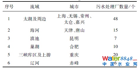 本研究調(diào)研時(shí)間跨度為2012年1月~2014年12月,調(diào)研范圍覆蓋太湖、巢湖、海河、遼河、滇池和三峽庫(kù)區(qū)及上游等6大流域,包括上海、常州、嘉興、太倉(cāng)、無(wú)錫、合肥、天津、唐山、赤峰、昆明、重慶等11座城市的106座城鎮(zhèn)污水處理廠(表1),總設(shè)計(jì)污水處理能力為1 519萬(wàn)m³/d,實(shí)際污水處理能力為1 264萬(wàn)m³/d,污泥年產(chǎn)生量為313萬(wàn)t(含水率80%),污水處理能力和污泥產(chǎn)量均達(dá)到全國(guó)總量的10%。污水水量、污水水質(zhì)、污泥產(chǎn)量和污泥含水率等數(shù)據(jù)均來(lái)自所調(diào)研污水處理廠的運(yùn)行日?qǐng)?bào)表。