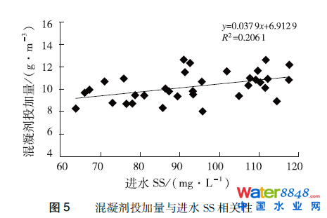 常州QT污水處理廠是典型的進(jìn)水以生活污水為主的污水處理廠,進(jìn)水SS和BOD5均呈現(xiàn)出顯著的季節(jié)規(guī)律性(圖4),冬春季進(jìn)水SS和BOD5濃度較高,而夏秋季進(jìn)水SS和BOD5較低,這可能是污泥產(chǎn)率呈季節(jié)性波動(dòng)的主要原因。此外,研究還發(fā)現(xiàn),該廠污水處理單元混凝劑投加量與進(jìn)水SS呈正相關(guān)性(圖5),進(jìn)水SS較高時(shí)一般會(huì)投加更多混凝劑,產(chǎn)生更多的化學(xué)污泥,這進(jìn)一步增大了污泥產(chǎn)率隨SS濃度的波動(dòng)幅度。