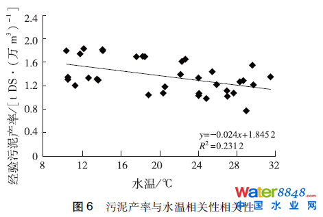 (3)經(jīng)驗(yàn)污泥產(chǎn)率與水溫呈負(fù)相關(guān)性,我國(guó)大部分區(qū)域溫度季節(jié)變化顯著,污泥產(chǎn)率隨水溫變化相應(yīng)產(chǎn)生波動(dòng),這可能是污泥產(chǎn)率呈現(xiàn)季節(jié)規(guī)律性的原因之一。
