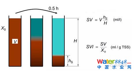 活性污泥的系統(tǒng)是一個(gè)由生物池和二次沉淀池共同組成的系統(tǒng)(MBR工藝通過膜分離技術(shù)替代了沉淀池的泥水分離作用),二次沉淀池良好的泥水分離是活性污泥法運(yùn)行好壞的關(guān)鍵;钚晕勰嗤ㄟ^生物池的曝氣處理后,流入到二沉池內(nèi),在二沉池內(nèi)靜沉沉淀,SV30基本可以代表這個(gè)靜沉沉淀的過程。二沉池的沉淀時(shí)間往往在2個(gè)小時(shí)左右,SV30用半小時(shí)的時(shí)間來代替2小時(shí)的沉淀,是因?yàn)镾V30是在一個(gè)靜止的環(huán)境中進(jìn)行的檢測(cè),而二沉池的2小時(shí)沉淀是一個(gè)連續(xù)進(jìn)水連續(xù)出水的環(huán)境,2小時(shí)的連續(xù)進(jìn)出水的沉淀效果和靜止?fàn)顟B(tài)下的30分鐘的效果接近。因此SV30是能夠反應(yīng)出二沉池內(nèi)的泥位高低的一個(gè)指標(biāo)。
