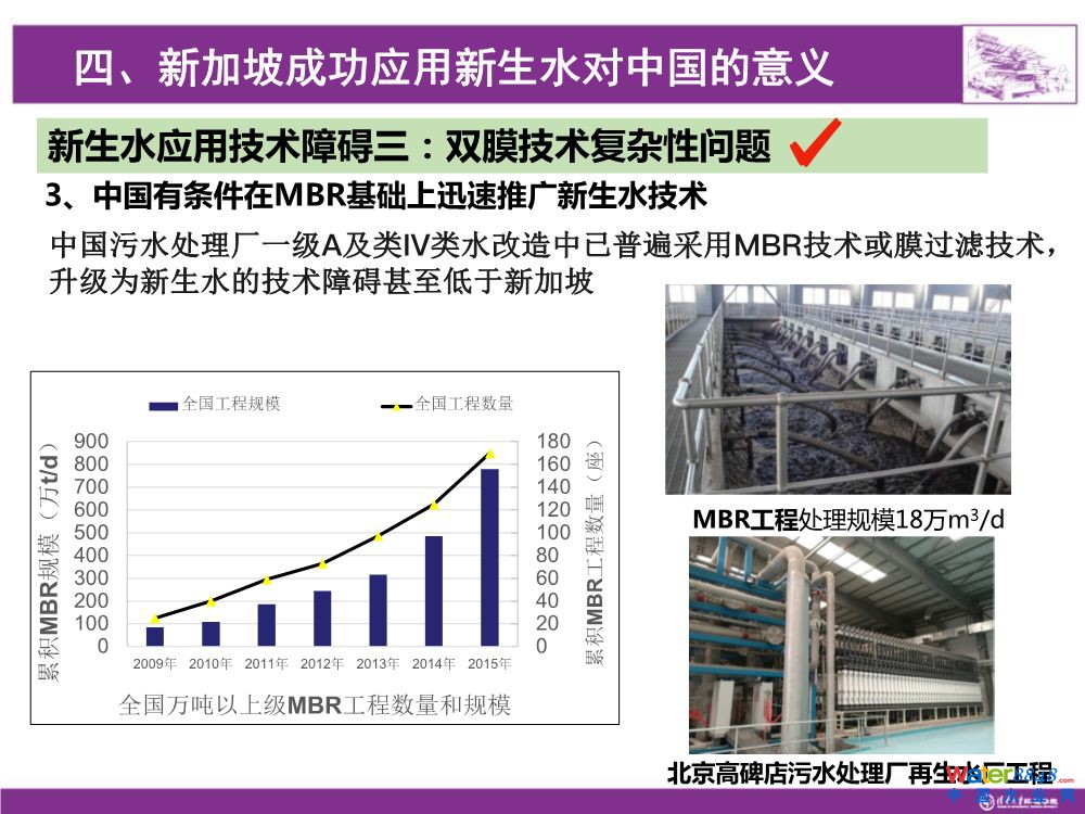新加坡正在規(guī)劃和發(fā)展的下一代NEWater生產(chǎn)工藝,是通過MBR取代活性污泥+二沉池+超濾膜的現(xiàn)有工藝。不僅僅需要建設(shè)雙膜法的新生水廠,下一步還要改造污水處理廠,因此對其是復(fù)雜的任務(wù)。但是在在中國,我們在一級A改造過程中大量使用了膜過濾和MBR,很多采用MBR,總數(shù)在全國MBR已經(jīng)超過了上千萬噸,膜過濾也在兩千萬噸以上。特別是北京、天津等大城市采用了準(zhǔn)IV類水的標(biāo)準(zhǔn),MBR在生活污水廠的應(yīng)用已經(jīng)比較廣泛,只需要在后段再加上RO就可以生產(chǎn)高品質(zhì)再生水,從已經(jīng)采用MBR或膜過濾的污水處理廠升級到高品質(zhì)再生水廠的投資成本較低。所以對我們國家現(xiàn)節(jié)這些廠的應(yīng)用來講,應(yīng)該是水到渠成,應(yīng)用的廣泛性就會非常大,有非,F(xiàn)實的意義。