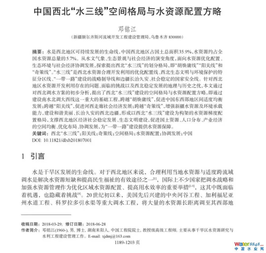 中國工程院院士 | 鄧銘江教授:中國西北“水三線”空間格局與水資源配置方略 即通過建設(shè)水量調(diào)配重大基礎(chǔ)工程,以期跨越“胡煥庸線”、“陽關(guān)線”和“奇策線”,支撐西北地區(qū)經(jīng)濟(jì)社會穩(wěn)定發(fā)展、生態(tài)