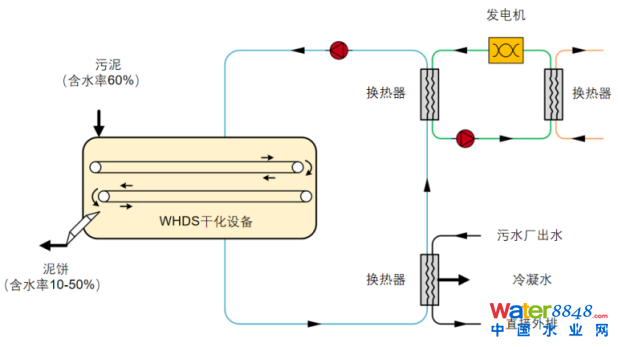 WHDS低溫余熱烘干技術(shù),就是利用煙氣、發(fā)電機(jī)余熱、蒸汽冷凝水、厭氧消化(燃?xì)庵茻崴、污泥裂解氣化燃燒等制熱水為設(shè)備熱源。如果后續(xù)工藝采用SGM氣化熔融,則可利用產(chǎn)生廢熱作為熱源對(duì)污泥進(jìn)行烘干的技術(shù)。