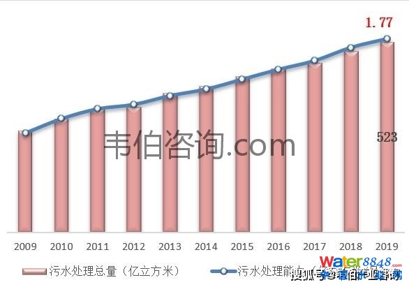 由于城鎮(zhèn)化和經(jīng)濟(jì)發(fā)展需求,中國(guó)城市近年來污水產(chǎn)生量和處理量呈上升趨勢(shì)。從城市污水處理情況來看,截至2019年底,全國(guó)城市污水處理廠處理能力1.77億立方米/日,累計(jì)處理污水量523億立方米。
