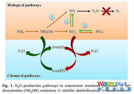 在廢水生物處理過程中,通過鐵介導(dǎo)的化學(xué)反應(yīng)制備了N2O。然而,應(yīng)注意的是,N2O的化學(xué)生產(chǎn)仍然主要由生物過程中產(chǎn)生的中間產(chǎn)物決定,如NO2-、HNO2和NH2OH(圖1)。這反過來又使化學(xué)過程控制變得高度復(fù)雜和困難。
