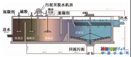 在普通高密度沉淀池的基礎(chǔ)上,同步加入磁介質(zhì)(磁粉相對(duì)密度為5.2,粒徑較。,通過絮凝、吸附、架橋的作用將水中的微小懸浮物或不溶性污染物與粒徑極小的磁性顆粒進(jìn)行極有效率的結(jié)合,來增加絮體的體積和密度。從而加快絮體的沉降速度,有效降低了澄清池的水力停留時(shí)間并增大了其表面負(fù)荷。