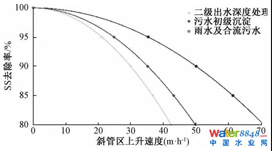由于原水水質(zhì)的不同,高密度沉淀池設(shè)計(jì)采用的水力負(fù)荷(上升流速)差異很大。對(duì)于污水深度處理、污水初級(jí)處理及雨水處理上升流速與SS去除率的關(guān)系如圖3所示。由于初期雨水各類污染物的可沉比例較高、有機(jī)物含量相對(duì)較低,同樣處理污水的高密度沉淀池如用于處理雨水或合流污水,其設(shè)計(jì)上升流速可高些。