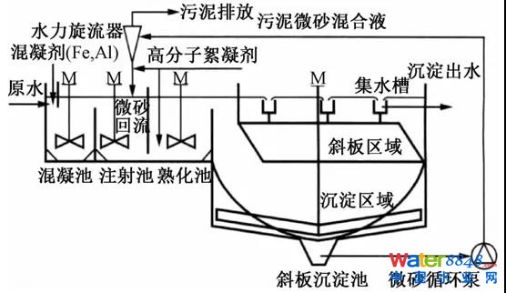 在普通高密度沉淀池的基礎(chǔ)上,將泥渣循環(huán)改為微砂循環(huán),形成了一種新型工藝—加砂高速沉淀池,以威立雅公司開發(fā)的Actiflor工藝為典型代表。該工藝通過投加微砂(粒徑為100~150μm),使污染物在高分子絮凝劑的作用下與微砂聚合成大顆粒的易于沉淀的絮體,從而加快了污染物在沉淀池中的沉淀速度,又結(jié)合斜板沉淀的原理,大大減少了沉淀池的面積及沉淀時(shí)間,并能得到良好的出水效果。
