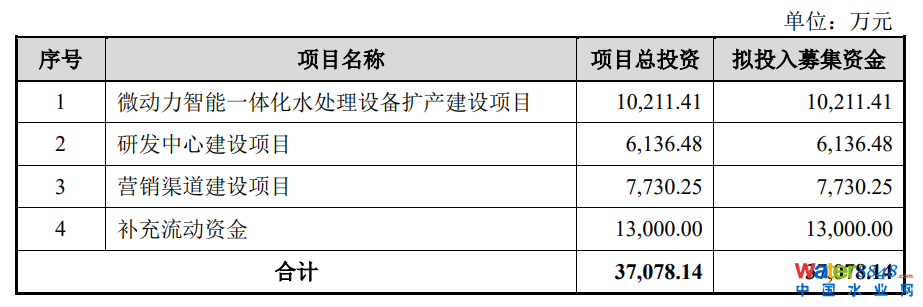 本次IPO,舜禹水務(wù)擬發(fā)行數(shù)量不超過(guò)4116萬(wàn)股人民幣普通股(A股),擬募資約3.71億元,將用于微動(dòng)力智能一體化水處理設(shè)備擴(kuò)產(chǎn)建設(shè)項(xiàng)目、研發(fā)中心建設(shè)項(xiàng)目、營(yíng)銷渠道建設(shè)項(xiàng)目建設(shè),以及補(bǔ)充流動(dòng)資金。