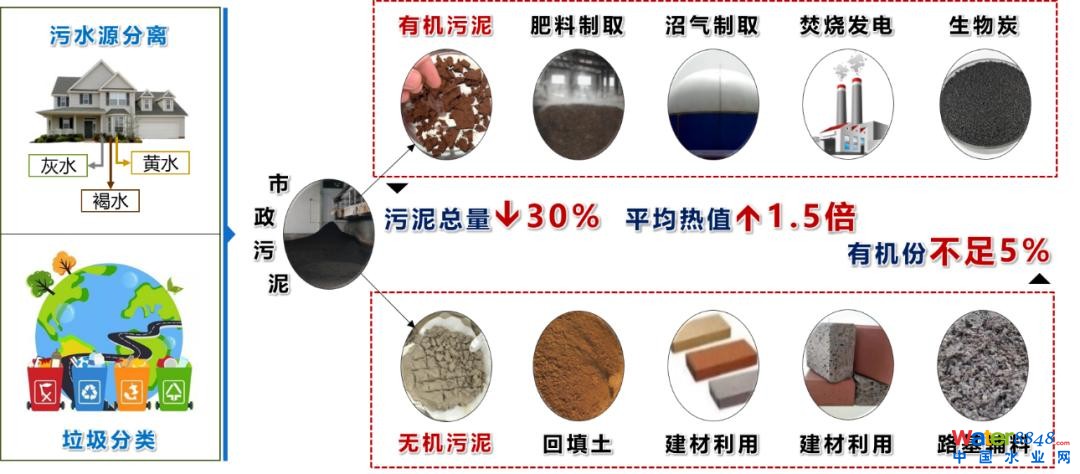 契合污泥低碳處置主流路線,借鑒污水源分離、垃圾分類的處置思路,開(kāi)展污泥綠色低碳處理處置方式創(chuàng)新研究。將生活污水廠污泥拆分為有機(jī)污泥、無(wú)機(jī)污泥兩部分,探索“污泥源分離”精準(zhǔn)資源化利用與安全處置。與傳統(tǒng)污泥處置相比,通過(guò)源分離預(yù)處理,污泥總量減少30%,有機(jī)污泥平均熱值提高1.5倍。